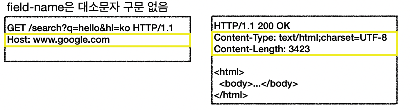 HOST , Content_type 등이 field-name이다 - message-body 내용을 제외하고, 필요한 모든 부가 메타데이터 정보가 다들어있음 (ex message-body의 내용, message-body의 크기, 압축,인증,요청클라이언트 정보,서버 어플리케이션정보, 캐시관리정보 등등)