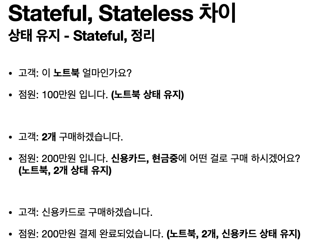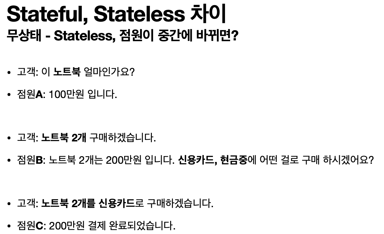 상태유지 무상태 - 상태유지 - 항상 같은 서버가 유지되어야 한다. 위 예에서는 중간에 다른 점원으로 바뀌면 안된다.