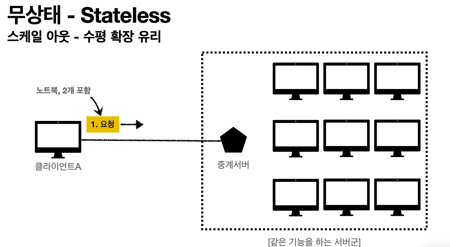 - 스케일아웃(수평확장)유리 - 같은 기능을 하는 서버군을 늘린다. 예로 같은 시간에 맞추어 발생하는 대용량 트래픽 같은 경우에서 stateless는 중요함