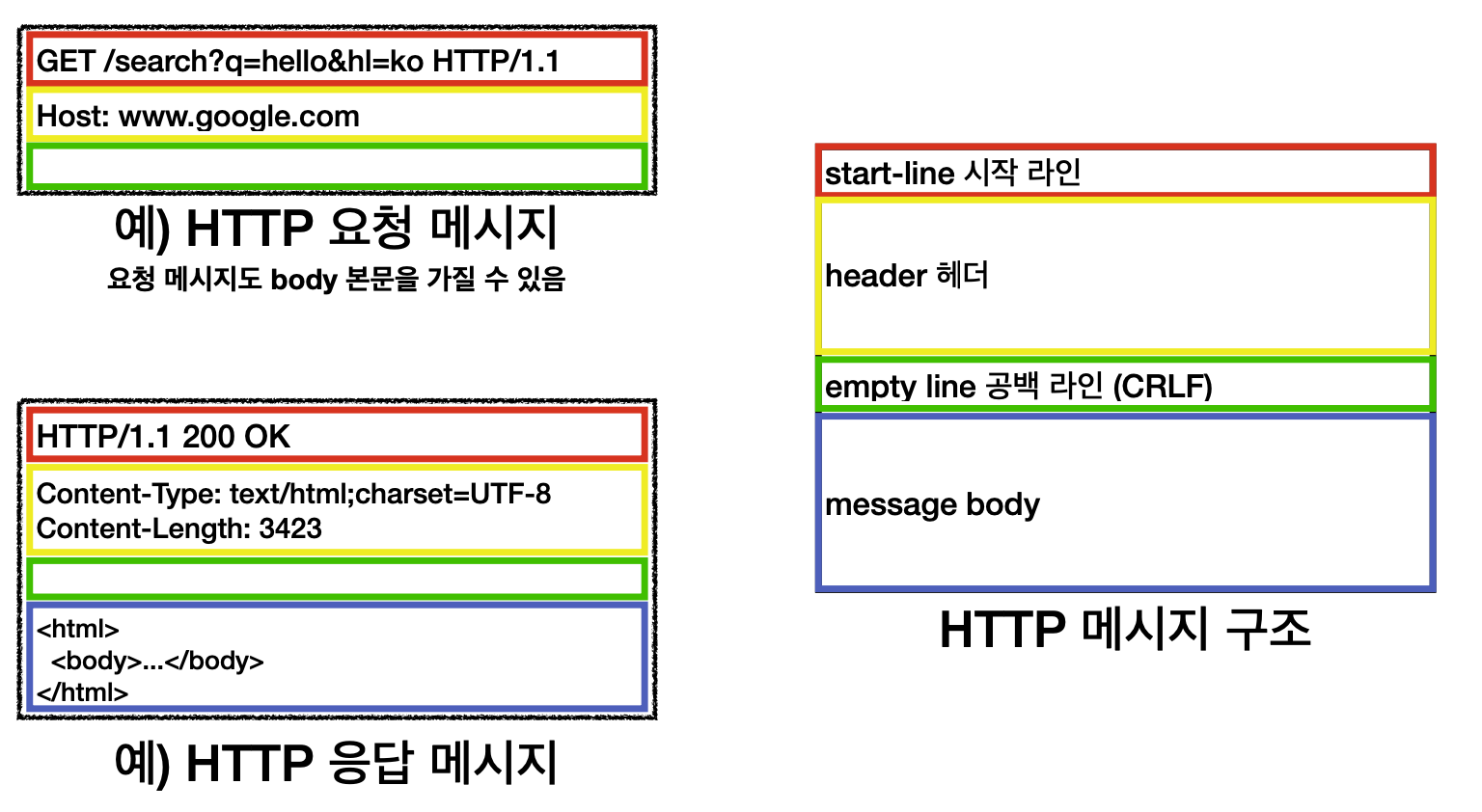 HTTP 요청 메세지에서는, 보낼 메세지가 없으면 message body를 공백으로둘 수있다. start-line 시작라인 (request-line / status-line)