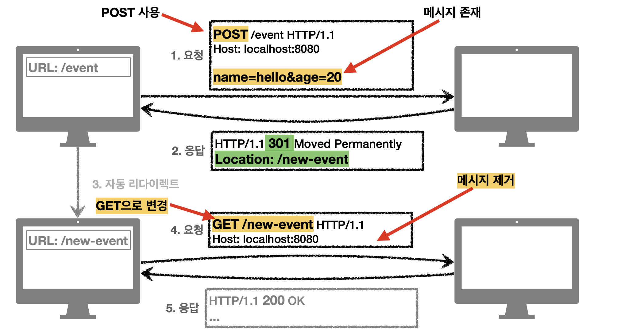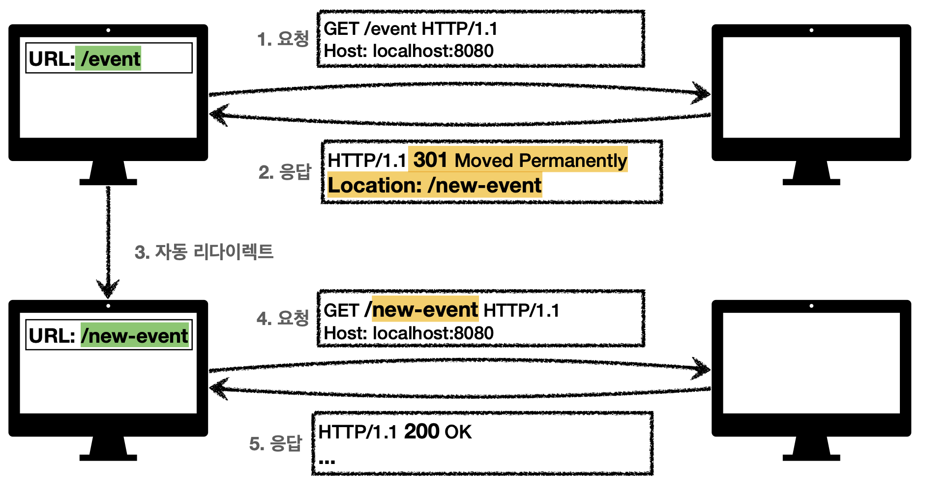- 다음은 서버 url 경로가 event에서 new-event로 바뀐 경우(영구 리다이렉션)이다. 이때 클라이언트가 event로 요청을 보내면 서버는 경로가 바꼈으므로 301 메세지와 함께 새로운 경로를 Location header에 담아서 보낸다. 3xx응답 결과에 Location 헤더가 있으므로 Location의 위치인 new-event로 자동이동(리다이렉트)한다.