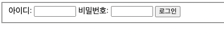 size 텍스트와 비밀번호 필드의 길이를 지정. 화면에 몇 글자가 보이도록 할 것인지를 지정한다. 예를 들어 글자수는 10개인데 size속성값을 5로지정하면 필드 크기는 5개 글자 크기에 맞추고 나머지 5개 글자는 화면에 보이지 않는다. value 텍스트 필드 요소가 화면에 표시될 때 텍스트 필드 부분에 보여 주는 내용이다. 이 속성을 사용하지 않으면 빈 텍스트 필드가 표시됨. 비밀번호 필드에서 사용하지 않는 속성 maxlength 텍스트 필드와 비밀번호 필드에 입력할 수 있는 최대 문자 수를 지정 <body> <form> <fieldset> <label>아이디: <input type="text" id="user-id" size="10"></label> <label>비밀번호: <input type="password" id="user-pw" size="10"></label> <input type="submit" value="로그인"> <!--type="submet" 전송타입을 넣습니다.--> </fieldset> </form> </body>