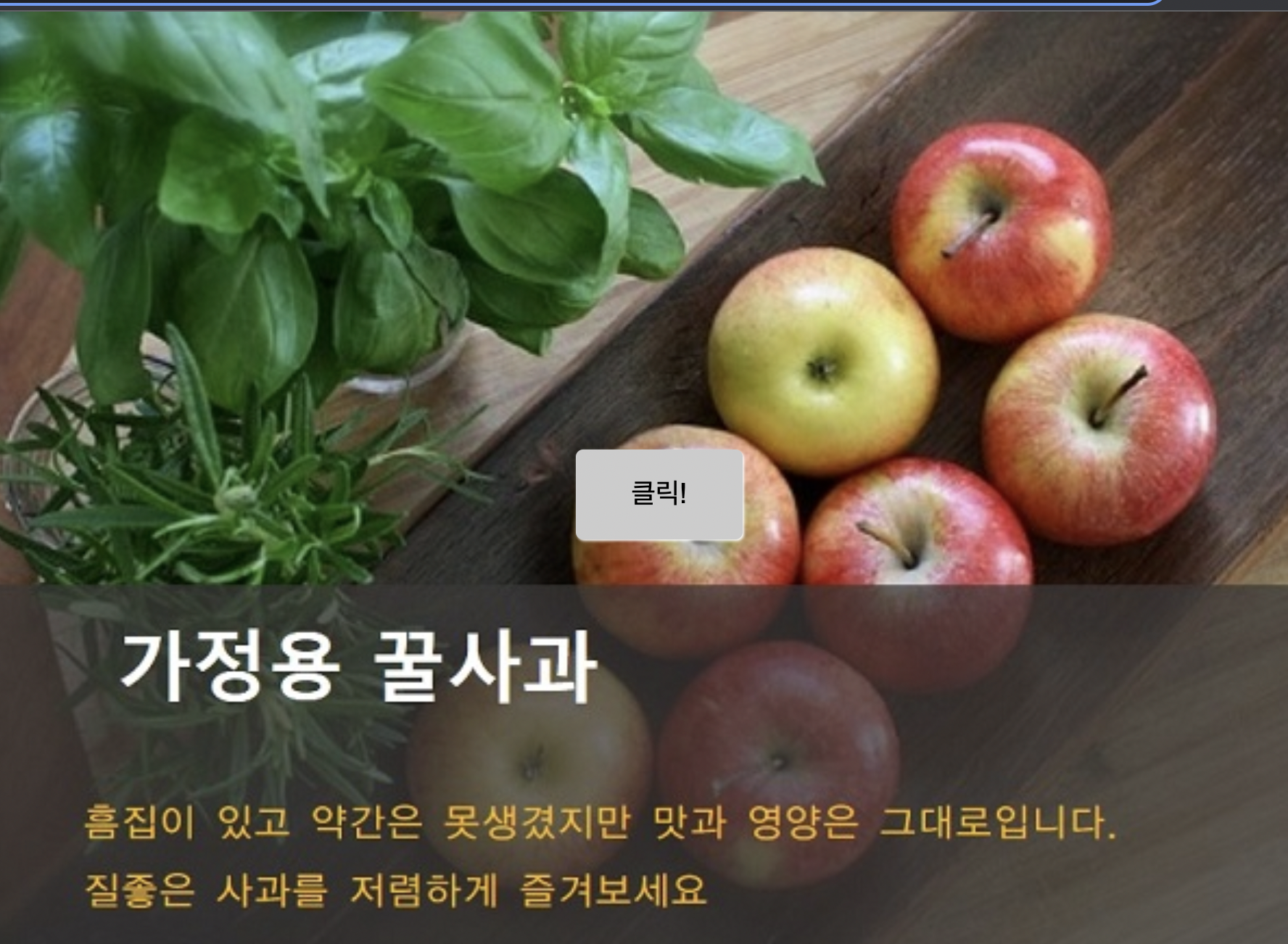 <!DOCTYPE html> <html lang="ko"> <head> <meta charset="UTF-8"> <meta name="viewport" content="width=device-width, initial-scale=1.0"> <title>세로로 중앙에 배치하기</title> <style> * { margin:0; box-sizing: border-box; } body { /*스타일을 적용하게 되면 body태그 내부에있는 button태그의 "클릭!" 텍스트가 중앙에정렬된다*/ background:url('./apple.png') no-repeat left top fixed; background-size:cover; display: flex;/*블록레벨요소로 변환*/ justify-content: center; /*주축 중앙배치*/ align-items: center;/*교차축 중앙배치*/ min-height: 100vh;/*뷰포트 높이의 100% -> 중앙에 배치됨 이해안되면 숫자 바꿔보면서 확인하면됨 결론적으론 vw vh는 뷰포트단위이므로 웹사이트의 너비나 높이가 변함에 따라 같이 크기가 바뀐다 반면 px로 지정하면 고정값이므로 웹사이트의 크기가 변함에따라 같이 변하지않아 pc로 만든 사이트가 모바일에서 깨지는 상황이 발생할수있음*/ } button { background-color:#ccc; font-size: 1.2em; padding:1em 2em; border:none; border-radius:5px; box-shadow:1px 1px 2px #fff; } </style> </head> <body> <button>클릭!</button> </body> </html>