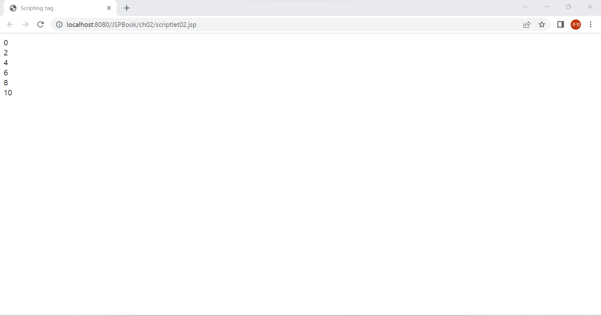 <html> <head> <title>Scripting tag</title> </head> <body> <% for (int i =0;i <= 10;i++){ if(i % 2 == 0) out.println(i + "<br>"); } %> </body> </html>