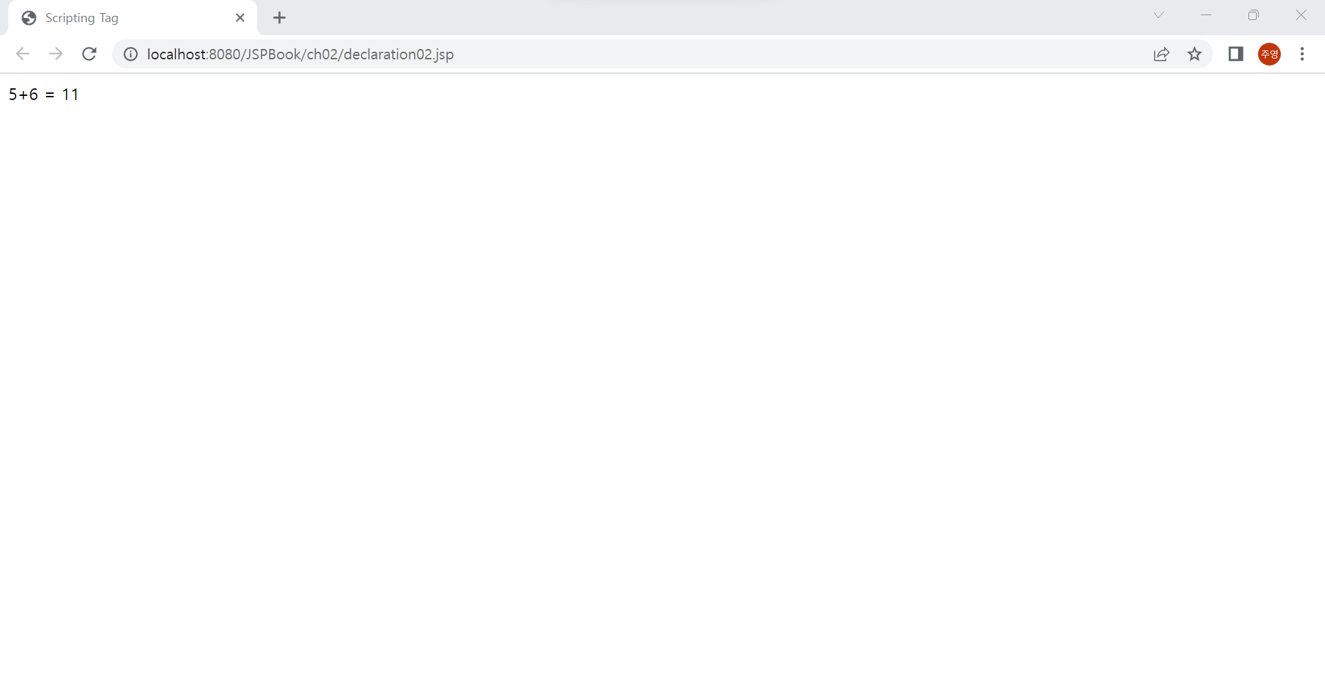 <html> <head> <title>Scripting Tag</title> </head> <body> <%! int sum(int a, int b){ return a+b; } %> <% out.println("5+6 = "+ sum(5,6)); %> </body> </html>