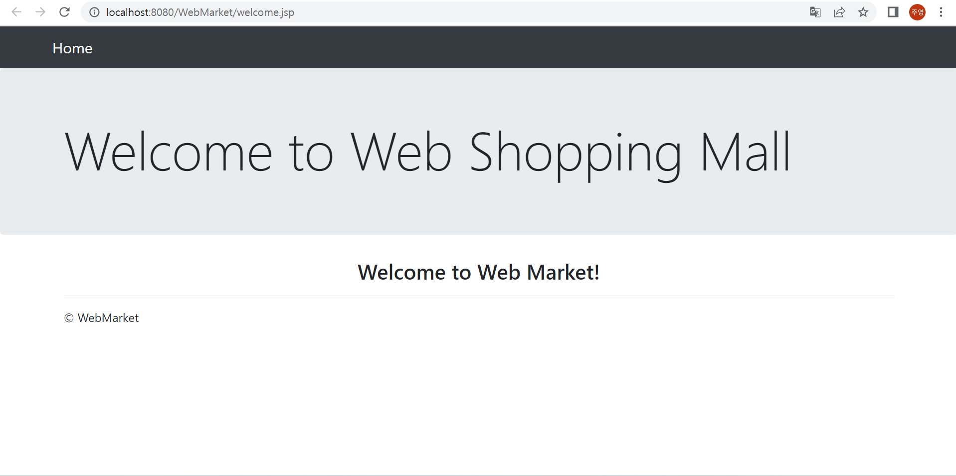 <html> <head> <link rel ="stylesheet" href = "https://cdn.jsdelivr.net/npm/bootstrap@4.0.0/dist/css/bootstrap.min.css"> <title>Welcome</title> </head> <body> <!--네비게이션 바--> <nav class ="navbar navbar-expand navbar-dark bg-dark"> <div class ="container"> <div class = "navbar-header"> <a class = "navbar-brand" href="./welcome.jsp">Home</a> </div> </div> </nav> <%! String greeting = "Welcome to Web Shopping Mall"; String tagline = "Welcome to Web Market!"; %> <!--점보트론--> <div class="jumbotron"> <div class = "container"> <h1 class = "display-3"> <%-- h1을 display-1, display-2, display-3, display-4로 나눈것이다. --%> <%= greeting %> </h1> </div> <hr> </div> <!--컨테이너--> <div class = "container"> <div class ="text-center"> <%-- 가운데 정렬 --%> <h3> <%= tagline %> </h3> </div> </div> <!--푸터--> <footer class ="container"> <p>© WebMarket</p> <%-- © html에서 표현할수있는 문자들 중 하나이다. --%> </footer> </body> </html>