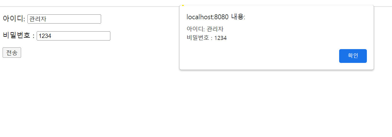 <%@ page language="java" contentType="text/html; charset=EUC-KR" pageEncoding="EUC-KR"%> <!DOCTYPE html PUBLIC "-//W3C//DTD HTML 4.01 Transitional//EN" "http://www.w3.org/TR/html4/loose.dtd"> <html> <head> <meta http-equiv="Content-Type" content="text/html; charset=EUC-KR"> <title>Insert title here</title> </head> <script type="text/javascript"> function checkform(){ alert("아이디: "+document.loginForm.id.value + "\n" + "비밀번호 : "+document.loginForm.passwd.value); //document.폼이름.파라미터 이름.값 } </script> <body> <form name ="loginForm"> <p> 아이디: <input type="text" name="id"> <p> 비밀번호 : <input type="text" name="passwd"> <p> <input type="button" value="전송" onclick="checkform()"> </form> </body> </html>