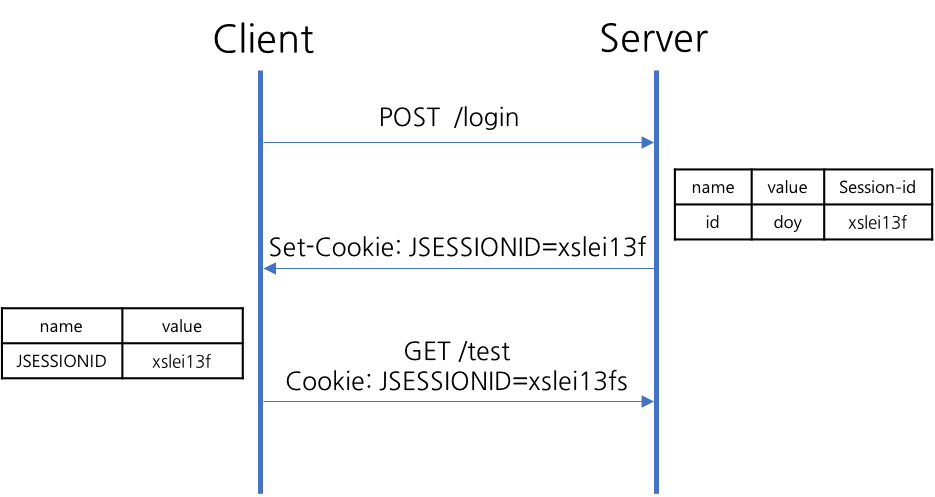 - 서버에서는 클라이언트를 구분하기 위해 , 각 클라이언트마다 각각 세션ID(쿠키)를 부여하고 웹 브라우저가 서버에 접속해서 브라우저를 종료할 때 까지 인증상태를 유지한다.